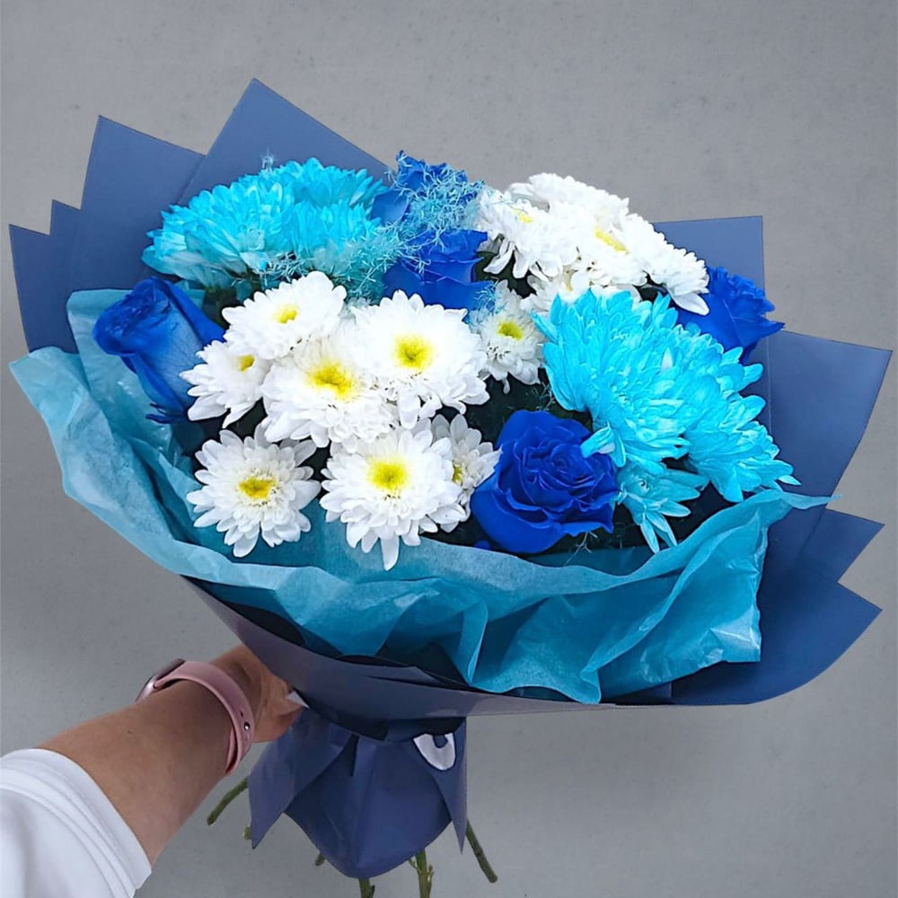 Букет из синих роз с хризантемой станет отличным подарком по любому случаю! Наши преимущества: 🌸 Индивидуальный подход: каждый букет формируется с учетом пожеланий клиента, что обеспечивает уникальность и запоминающийся характер подарка. 🌸 Быстрая доставка: мы гарантируем оперативную доставку букетов, чтобы они приносили радость получателям в кратчайшие сроки. 🌸 Гарантия качества: наша компания обеспечивает высокое качество букетов, благодаря использованию только свежих и качественных цветов. Этот букет станет прекрасным подарком к любому случаю: свадьбе, дню рождения, юбилею или просто для того, чтобы порадовать близких. Он украсит любой интерьер и принесет множество радостных моментов. Закажите букет уже сегодня и подарите своим близким незабываемые эмоции!