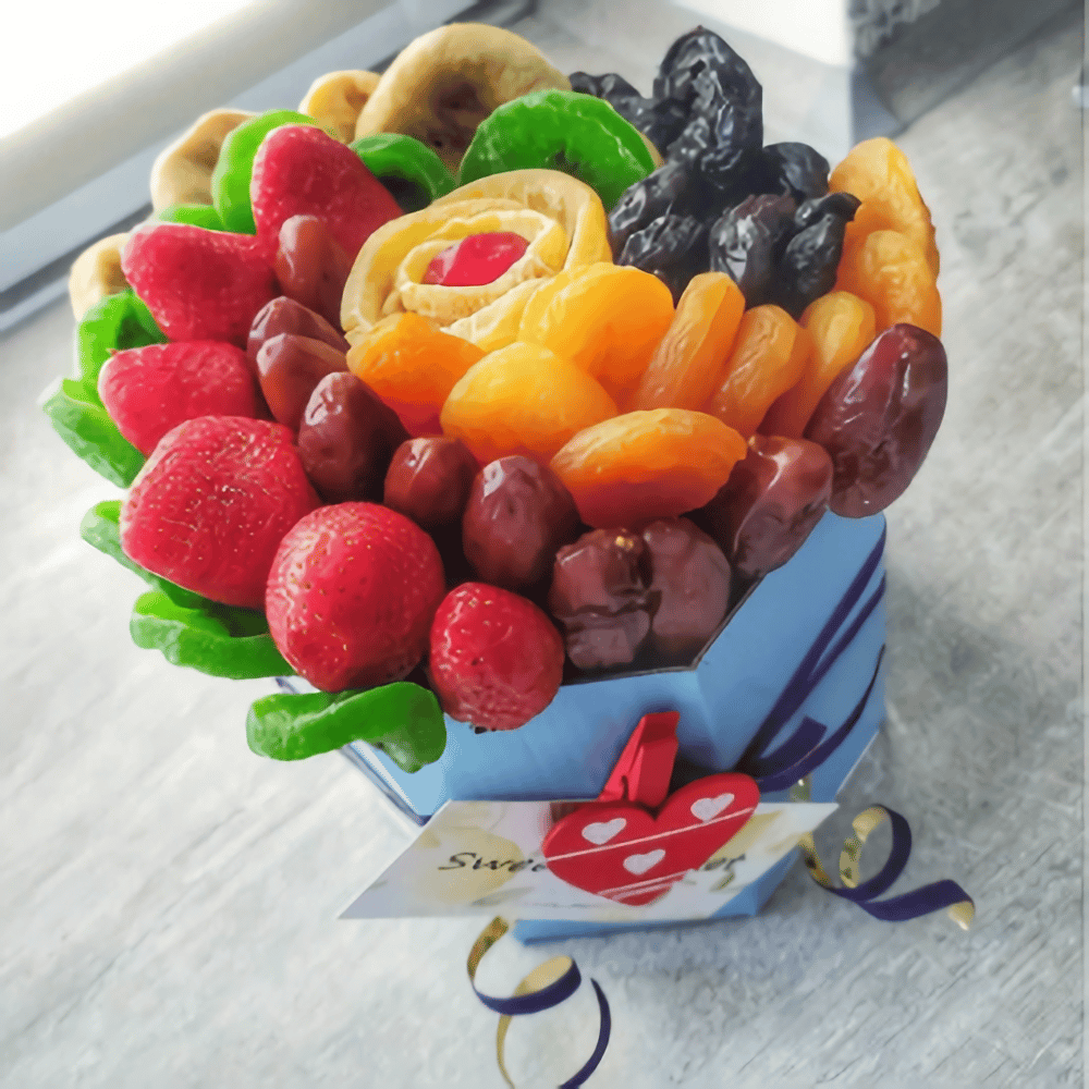 Яркий и мультивитаминный букет из сухофруктов в шляпной коробке.