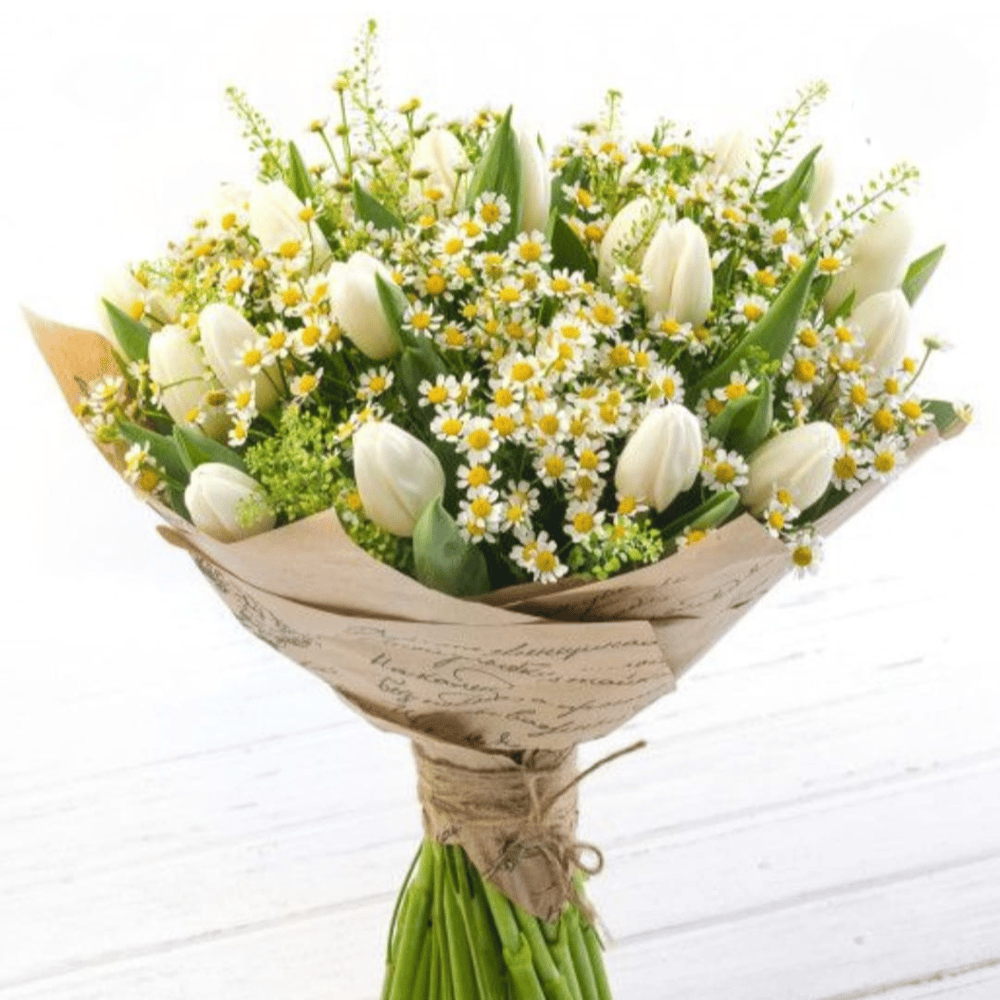 Этот нежный и стильный букет состоит из изящных тюльпанов и нежных матрикарий, олицетворяющих весеннее настроение и радость. Упакован в эко-стиле в крафтовую обертку, что придает ему особый шарм и естественность. Идеальный подарок для тех, кто ценит нежность и простоту во всем.