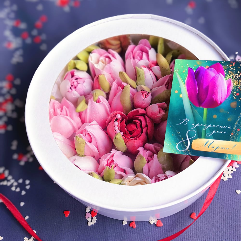 Такой подарок можно подарить и маме, бабушке, дочке, жене, подруге, сотруднице, учителю. Они долго будут в восторге от такого букета. В зефире содержится минимальное количество сахара его даже можно диабетиком. Состав: агар-агар, сахар, ванилин, вода, пюре клубничное ( можно на выбор лесные ягоды, малина, яблочное, манго+персик, груша ванилин), яичный пастеризованный белок, краситель пищевой. В каждую нашу работу мы добавляем позитивные эмоции и любовью.