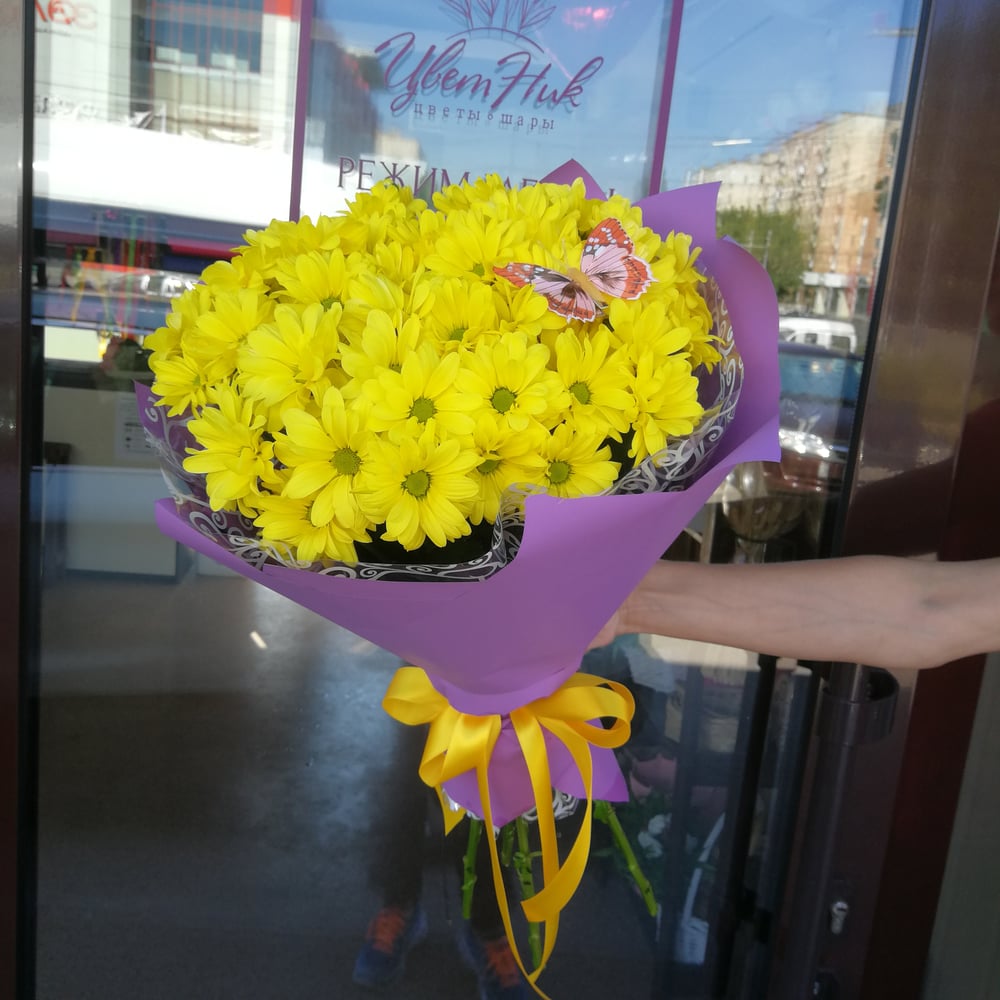 Солнечный букет из желтой хризантемы в яркой упаковке станет приятным знаком внимания дорогому человеку, цвет букета поднимет настроение. И он долго будет радовать своей свежестью, кустовая хризантема один из самых стойких цветов
