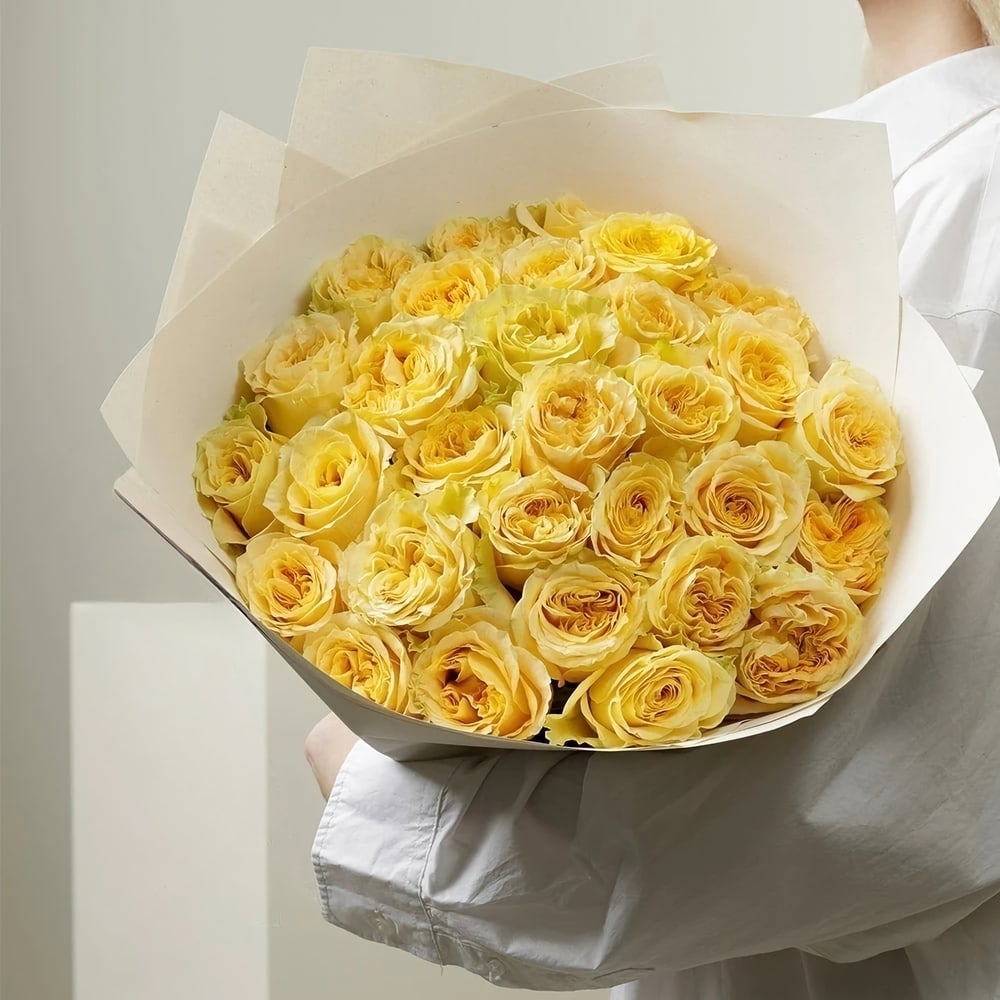Желтые кустовые пионовидные розы. Каждый цветок в этом букете является настоящим чудом природы. Гладкие и величественные лепестки создают впечатление, будто они оживают и наполняют комнату своим неповторимым ароматом. Лимонные оттенки роз передают свежесть и энергию, пробуждая чувства и принося радость.