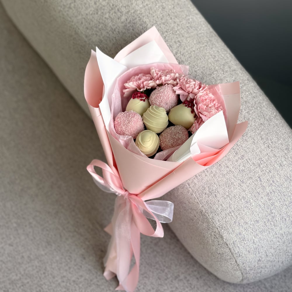 Состав: — 225 грамм свежей клубники в шоколаде количество ягод 7 — 5 розовых диантусов шоколад : розовый, белый декор : дробленная сублимированная малина, шоколадные полоски, кокосовая струж...
