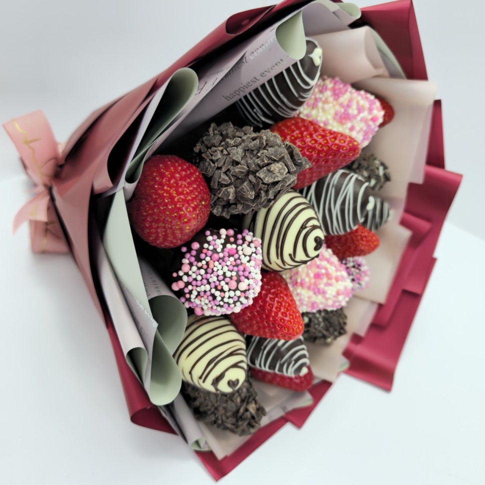 Букет клубники в шоколаде со свежей клубникой от бренда DariDV — это не просто сладкое угощение, а настоящий кулинарный шедевр, который станет прекрасным подарком для любого повода. В составе букета гармонично сочетается 15 ягод клубники, покрытых высококачественным бельгийским шоколадом — как белым, так и темным, что придаёт каждой ягоде уникальный вкус и текстуру.