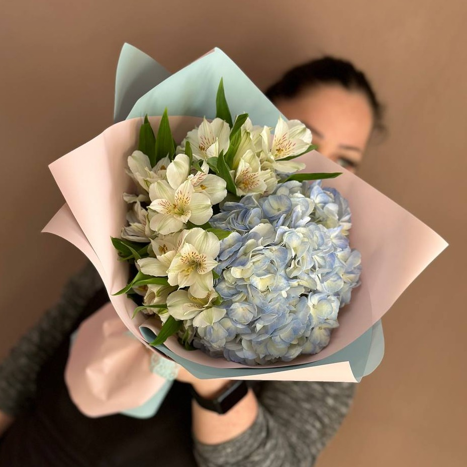 Сборный букет с гортензией и альстромерией в оформлении