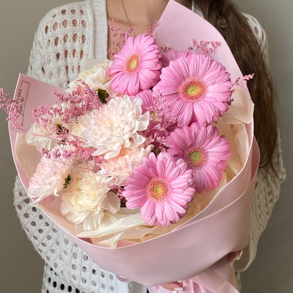 Дуо-букет с герберами, хризантемами и сухоцветами – это не просто композиция, это тщательно продуманный диалог между живой энергией и застывшей красотой.