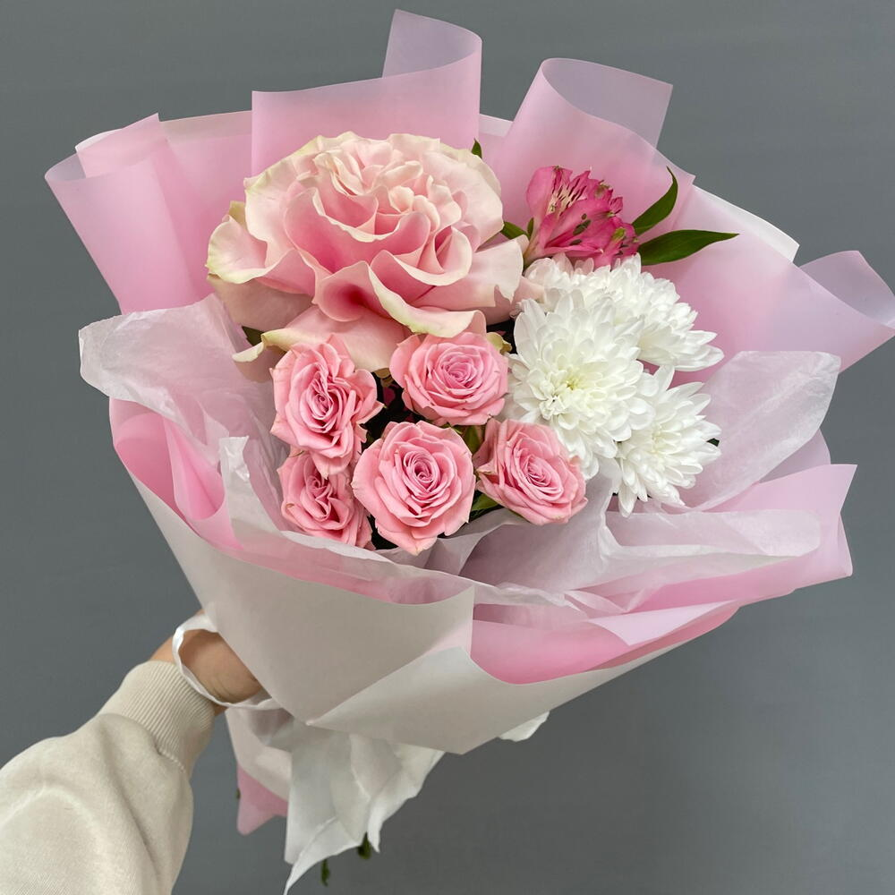 Это очаровательная композиция, выполненная в нежных розовых оттенках, идеально подходящая для выражения теплых чувств и приятных слов. В букете использованы изысканные французские розы, символизирующие любовь и грацию, нежные альстромерии, придающие воздушность, а также хризантемы кустовой и кустовые розы, создающие гармоничный объем и деликатность. Все цветы аккуратно собраны в стильную матовую упаковку, которая подчеркивает романтичную и элегантную атмосферу. Такой букет станет прекрасным комплиментом и подарком, наполненным теплом и нежностью.