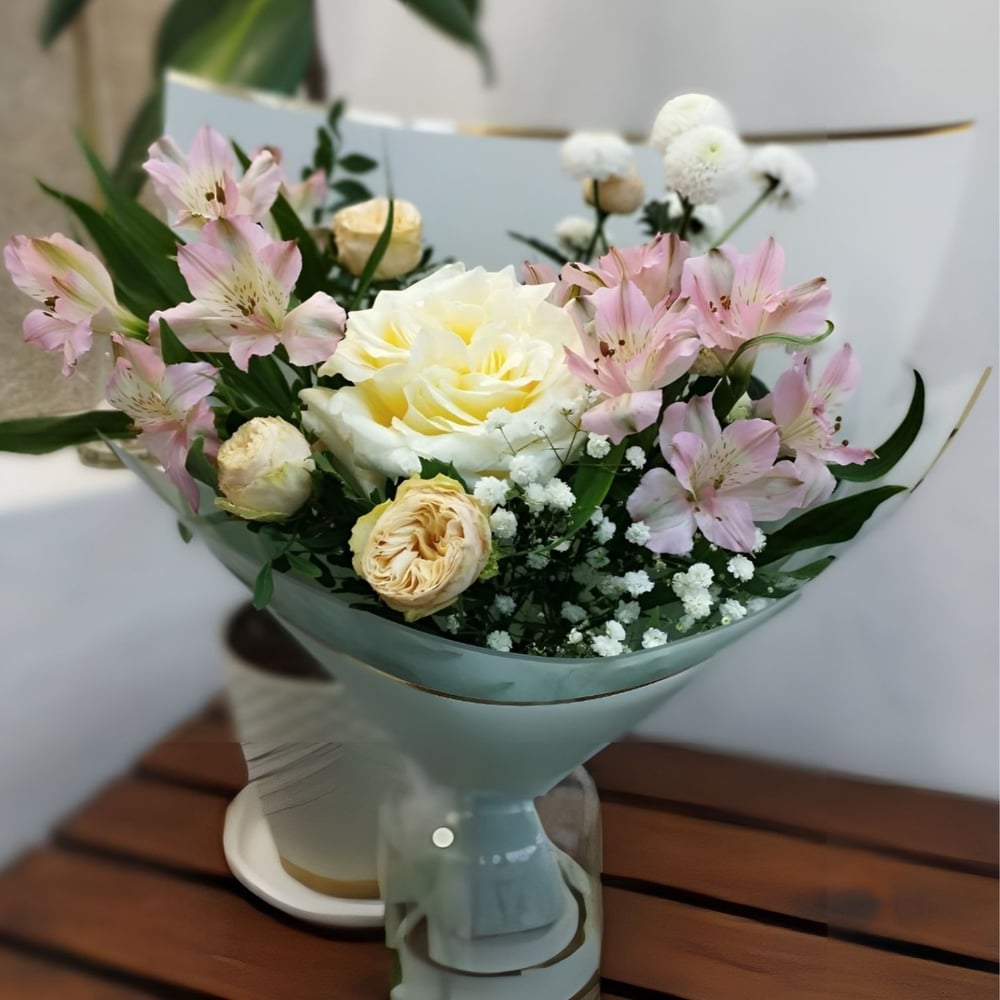 "Velo di Fiore" — это не просто букет-комплимент, а настоящий шедевр, вобравший в себя всю красоту и нежность природы. Его словно окутывает легкий цветочный вуаль, который придает ему таинственность и романтизм. Каждый элемент этого букета — это отдельная история любви: тонкие стебли цветов, как ласковые прикосновения, обвивают друг друга, создавая гармонию и теплоту. Размер: Диаметр до 35 см., высота до 40 см. ⠀ Состав: роза пионовидная Канделайт - 1 шт., альстромерия - 2 шт., роза кустовая пионовидная - 2 шт., хризантема кустовая Ньютон - 1 шт., пистасия - 2 шт., упаковка, лента Обращаем Ваше внимание, что указанные в описании товара ширина, высота букета и его вес являются справочной и ориентировочной информацией.