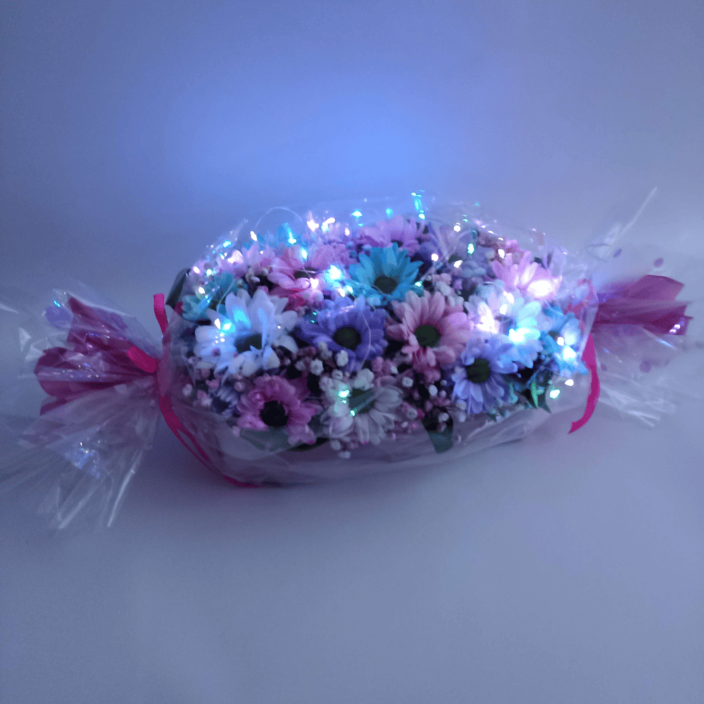 Сказочный букет из свежих хризантем и гипсофилы, в виде сладкой конфеты, украшен светодиодной гирляндой. Цветочки подсвечиваются волшебным светом, создавая атмосферу праздника и радости. Эта композ...