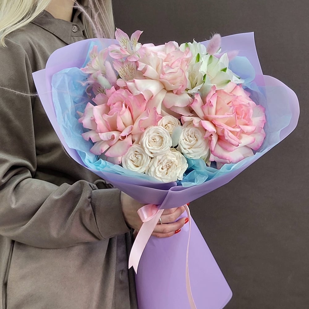 Этот утонченный букет состоит из красивых роз эквадор, нежной альстромерии, изысканных роз кустовых, элегантного лагуруса и стифы. Благодаря стильной упаковке в корейской пленке, украшенной тишью и лентой из атласа, этот букет станет прекрасным подарком для любого случая.