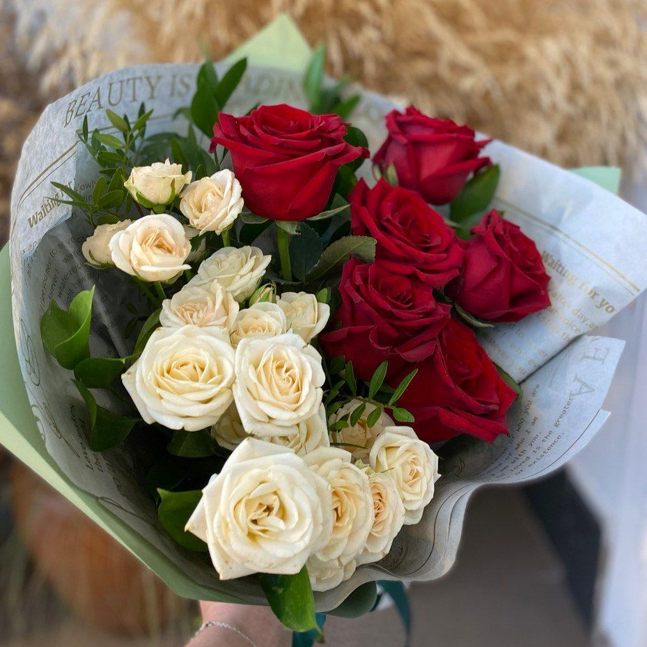 Этот букет собран из прекрасных цветов - белых и красных роз, которые создают нежный и романтичный образ. Зелень добавляет свежести и природной красоты. Букет оформлен в упаковку, что придает ему стильный и элегантный вид. Дополнительно украшен лентой, которая подчеркивает изысканность и безупречность этого букета. Он станет прекрасным подарком для любого события, будь то день рождения, юбилей или свадьба.