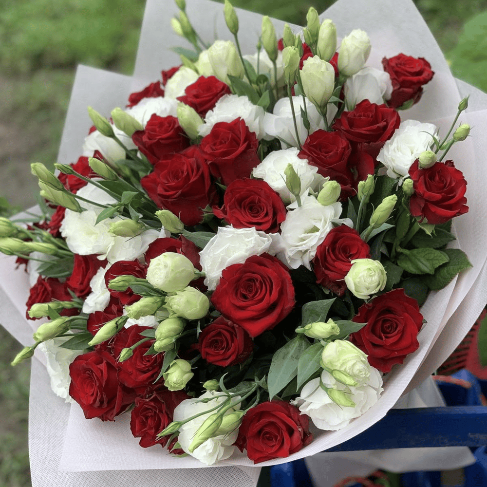 Роскошный букет тз 29 красных роз и 12 ветвей белой эустомы в стильном оформлении