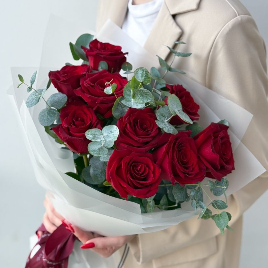 Красные розы с эвкалиптом в стильной упаковке, подходит на любой повод!