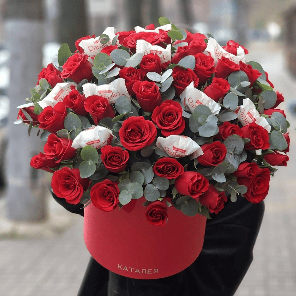 Шляпная коробка с цветами «Букет красных роз с конфетами»