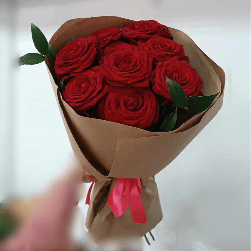 Этот изящный букет состоит из красивых роз, густого зеленого рускуса, оформленных в стильной упаковке из крафт-бумаги. Это удачное сочетание нежности и элегантности, которое подарит радость и удовольствие вашему близкому человеку.