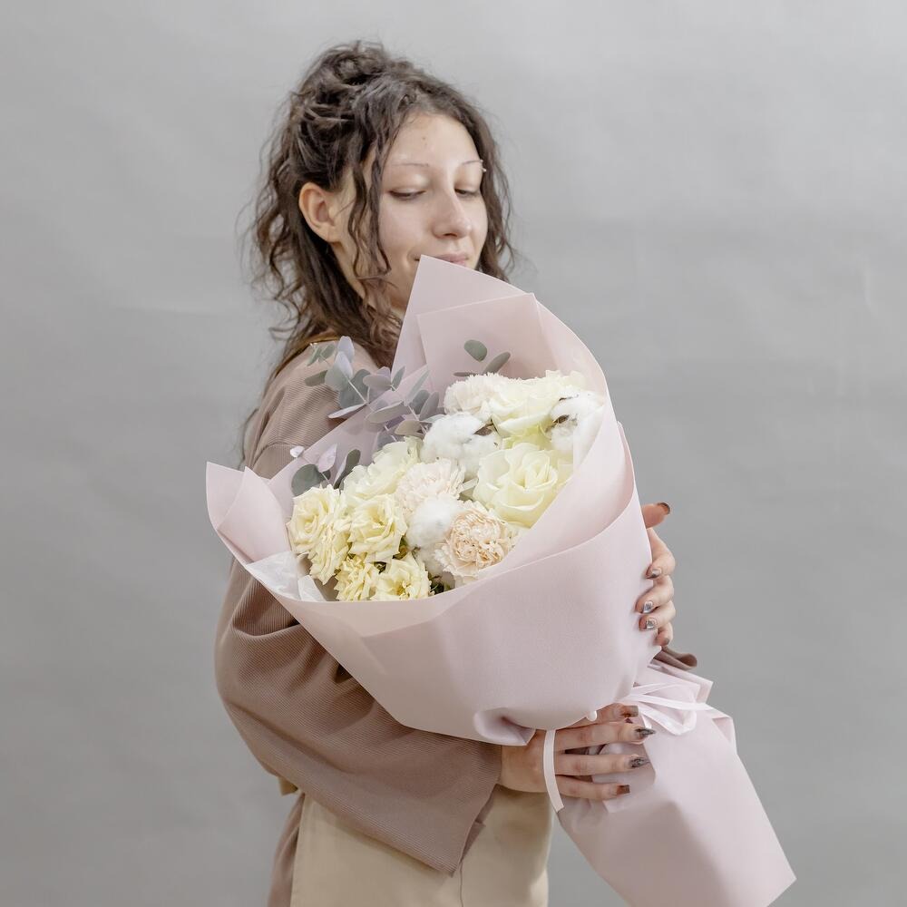 Нежный букет с французскими розами, кустовой розой Солинеро, коробочками натурального хлопка, кремовыми диантусами и эвкалиптом в стильном оформлении.