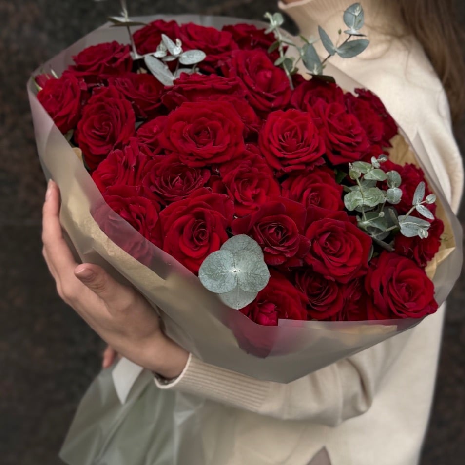 Яркий букет крупных кустовых алых роз с эвкалиптом украсит любой вечер