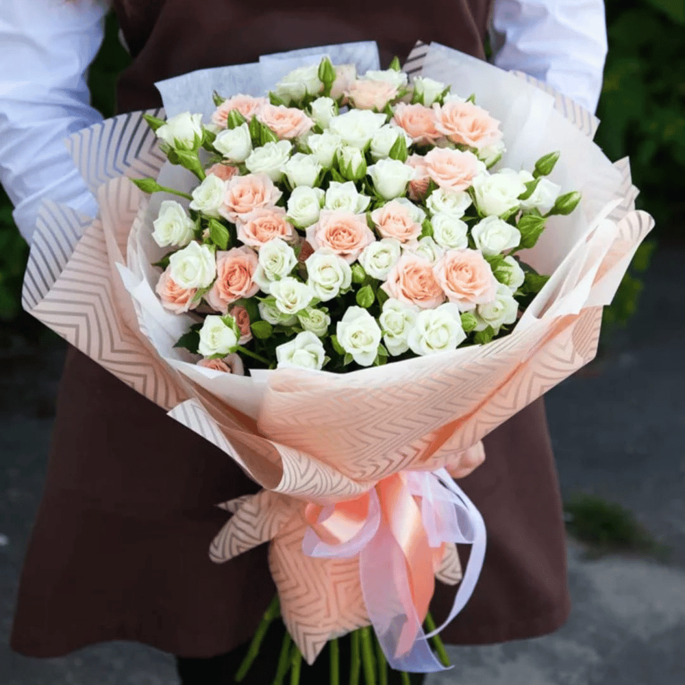 Букет кустовых роз от Pink Flowers - это стильный и элегантный подарок, который подойдет для любого повода. Букет состоит из 19 кустовых роз, которые собраны на стеблях. Это придает букету объем и пышность, делая его привлекательным и запоминающимся. Букет кустовых роз от Pink Flowers - это отличный выбор для тех, кто хочет сделать особенный подарок, который будет радовать и напоминать о вас долгое время.