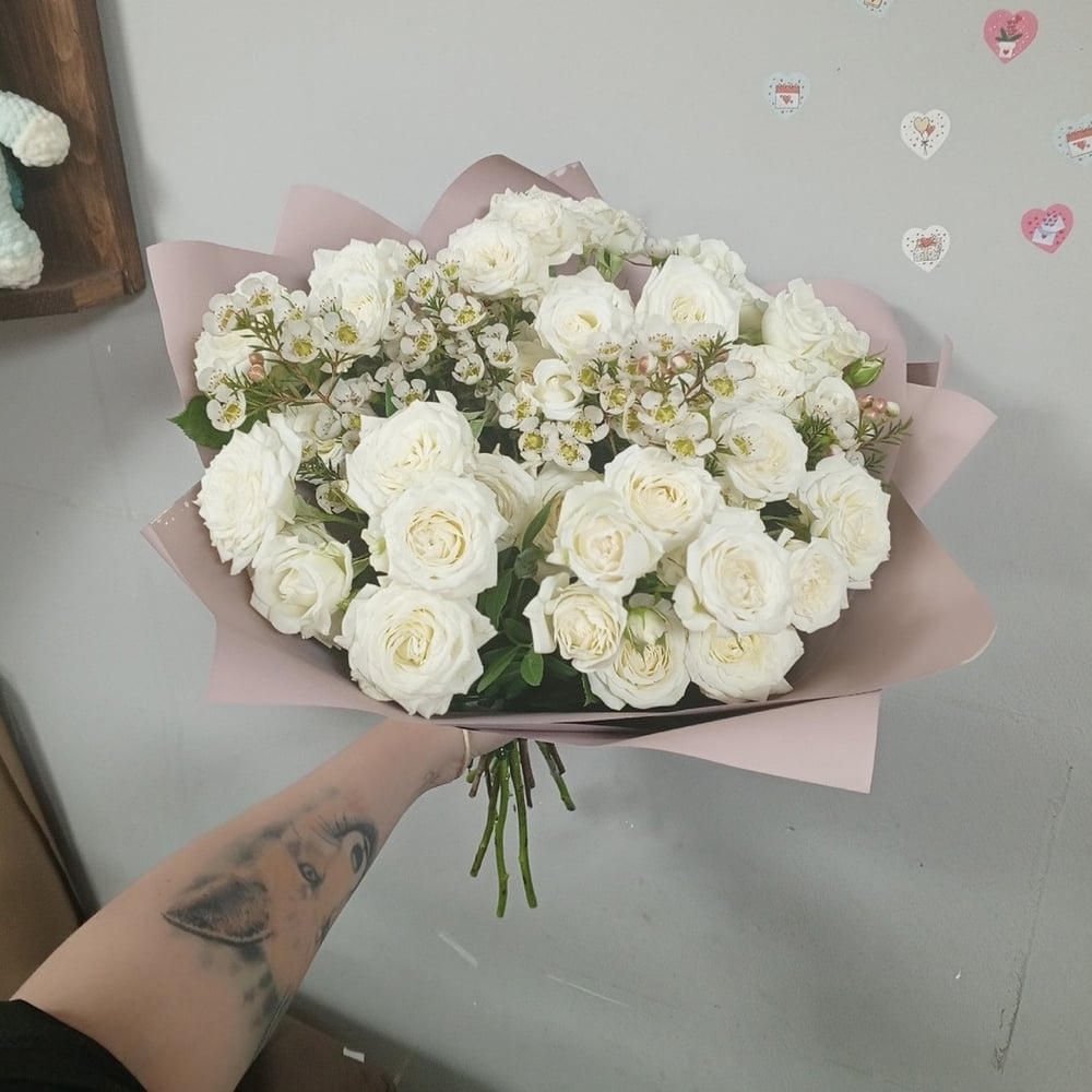Ароматные кустовые розы с ваксфлауэром-прекрасный подарок.