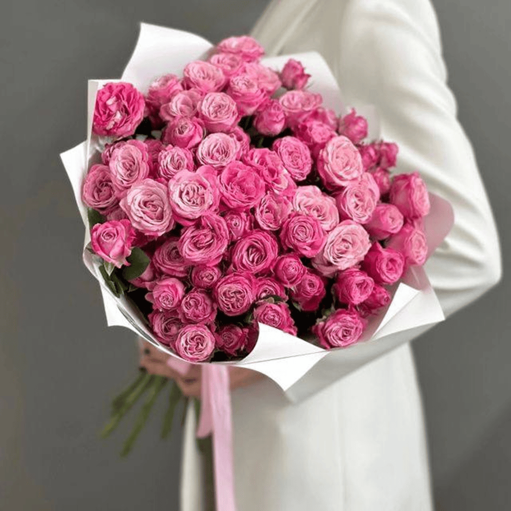 Нежный и стильный букет из девяти кустовых роз, упакованный в эксклюзивную авторскую упаковку. Этот букет станет прекрасным подарком для любого торжественного события или просто для того, чтобы порад…