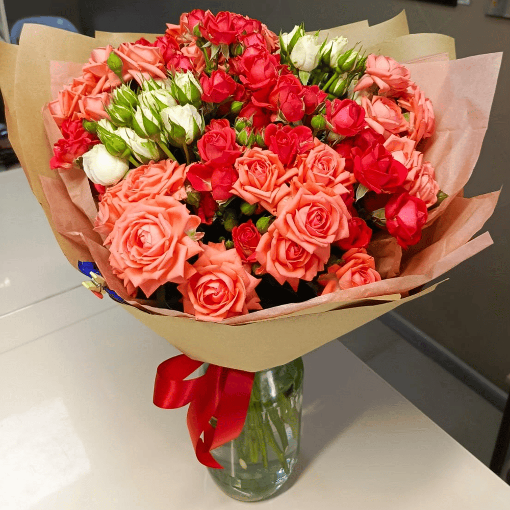 Яркий и выразительный букет кустовых роз красного и розового цвета в нейтральной упаковке из тонкой розовой тишью и крафтовой бумаги. Такой букет прекрасно подойдёт чтобы поздравить коллегу или руко…