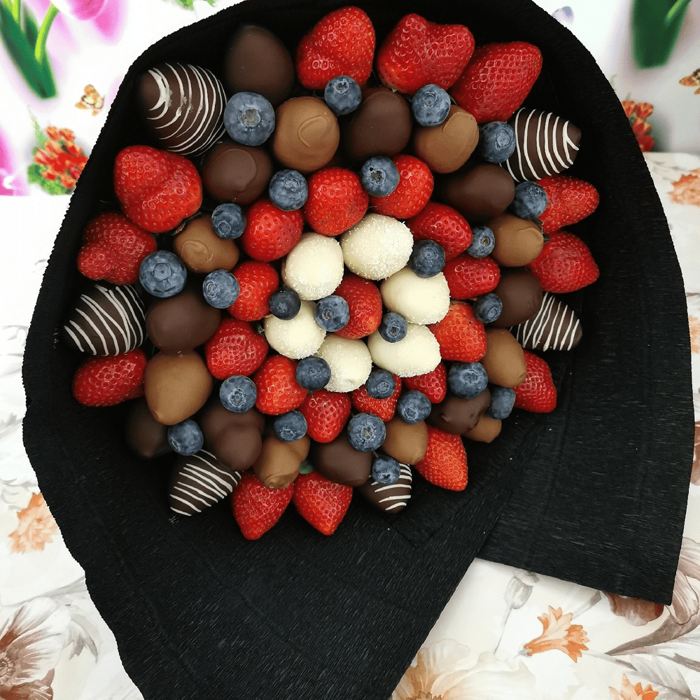 Очень красивый букет из клубники и ежевики,голубики, клубники в шоколаде с разнообразными посыпками. Возможно добавление топпера, открытки с вашими пожеланиями.