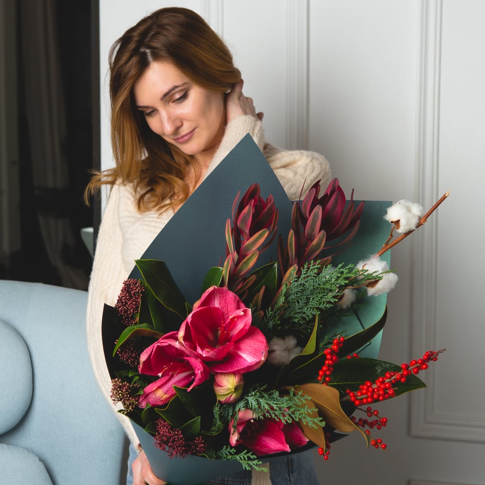 Букет с натуральным хлопком, ягодами илекса и амариллисом подарит хорошее настроение в самый снежный день)