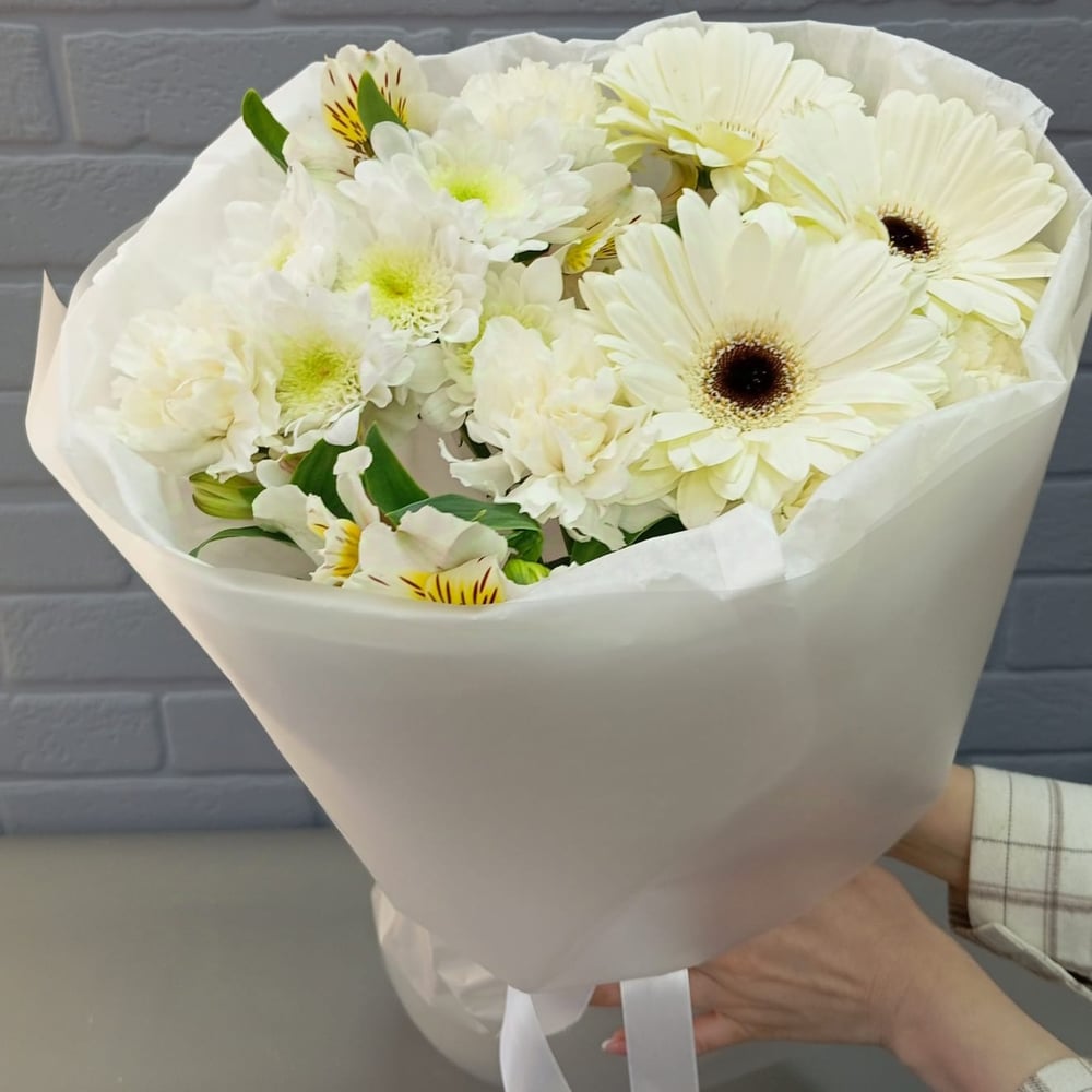 Этот изящный букет состоит из ярких и красивых цветов: гербер, хризантем кустовых, диантусов и альстромерий. Он упакован в стильную матовую пленку, которая придает ему особый шарм, а также украшен тишью, делая его идеальным подарком для любого повода. Настоящее проявление нежности и заботы!