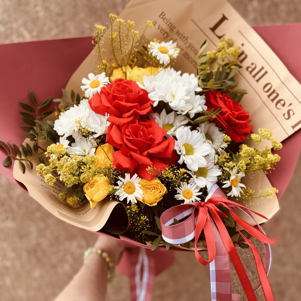 Яркий, сочный букет с ромашковидными хризантемами, ромашками, яркими алыми розами , кустовыми пионовидными розами, обязательно поднимет настроение вашей любимой👌🌸☀️