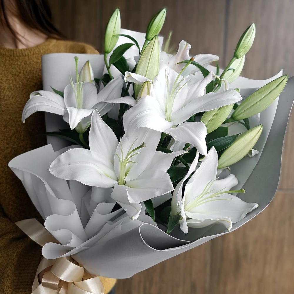 Белые лилии олицетворяют красоту, роскошь, непорочность и милосердие. Такой букет можно преподнести на любой случай — на рождение ребёнка, свадьбу, на День матери или просто в знак романтических чу...