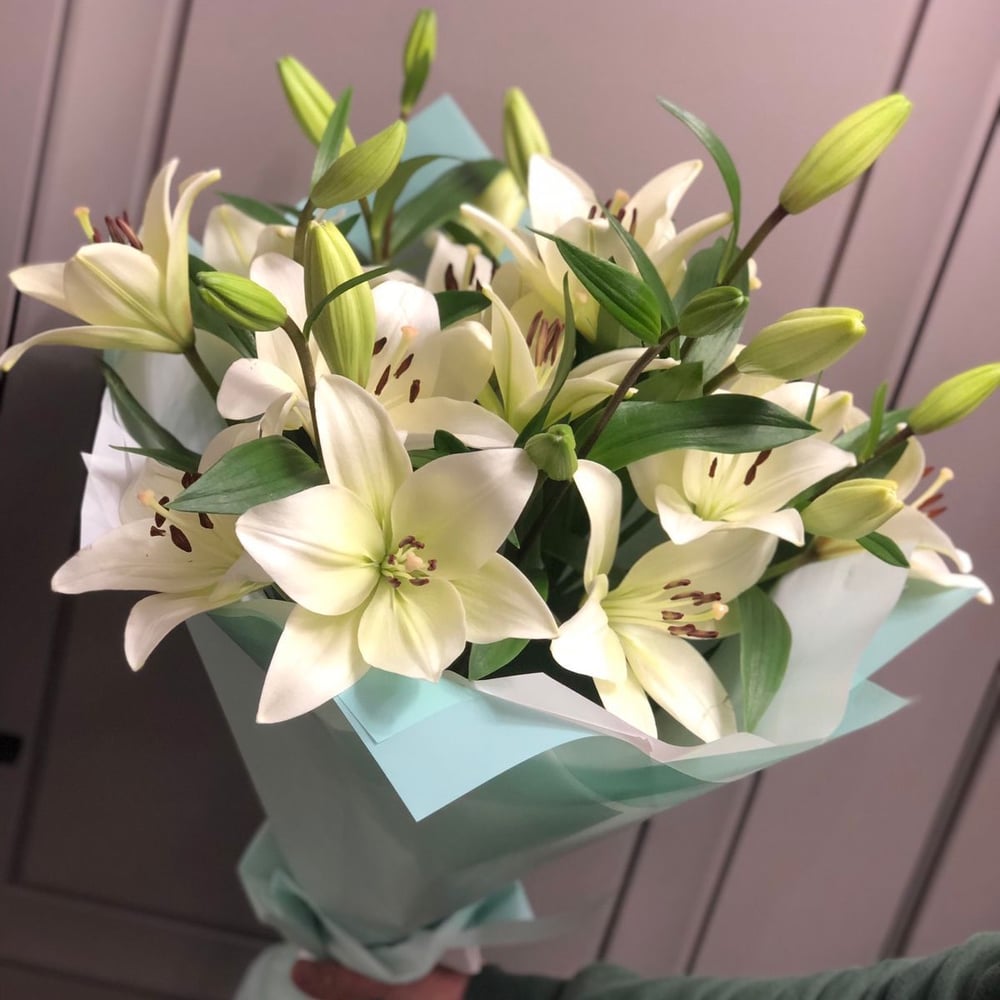 Букет из 6 веток Лилии оформлен в дизайнерскую бумагу