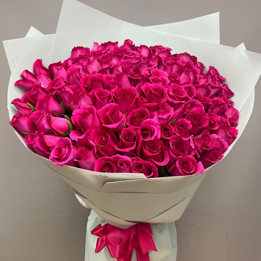 Букет из 101 малиновой розы — это эффектное и яркое признание в чувствах. Глубокий малиновый оттенок символизирует страсть, восхищение и энергию любви