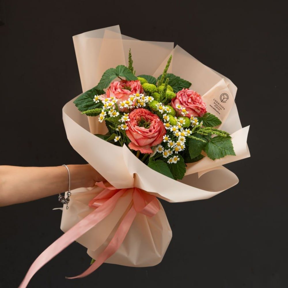 Представьте себе: вы художник, и вдруг перед вами появляется муза в виде букета. Нет, не просто букета, а настоящего произведения искусства, которое так и просится на холст! Этот цветочный шедевр — настоящая находка для ценителей прекрасного. А чтобы эта цветочная симфония выглядела по-настоящему роскошно, мы облачили её в многослойную корейскую упаковку оттенка персиковой пудры. Теперь это не просто букет — это готовый сюжет для картины! Такой букет станет идеальным подарком для любого случая. Он не только порадует получателя своей красотой, но и украсит любой интерьер, превратив обычное пространство в художественную галерею. Так что если вы ищете подарок, который заставит художника отложить кисти и просто любоваться — вы его нашли! Размеры: высота до 55 см., диаметр до 30 см. ⠀ Состав: роза микс - 3 шт., хризантема кустовая Делигрин - 2 шт., матрикария - 2 шт., садовая зелень -3 шт., упаковка, ленты