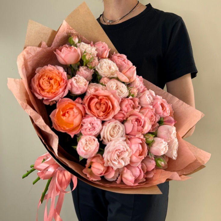 Большой букет кустовых пионовидных роз, упакованный в стильный крафт.