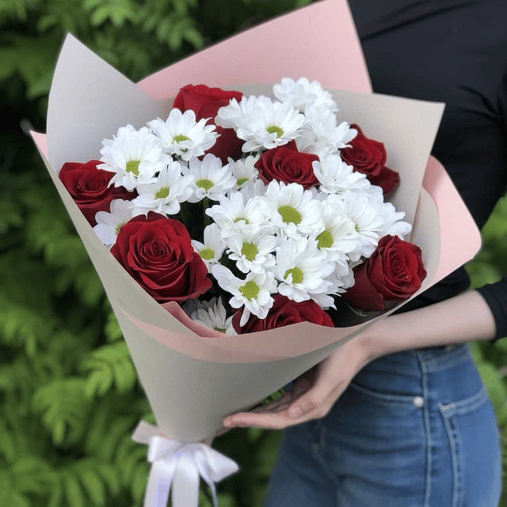 Красивый букет из 7 красных роз, 6 белых хризантем в стильном оформлении