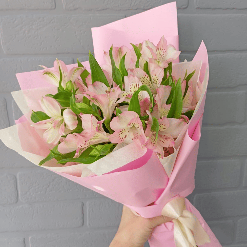 Букет из трех альстромерий, в нежно-розовой упаковке. Будет милым подарком по любому поводу и без