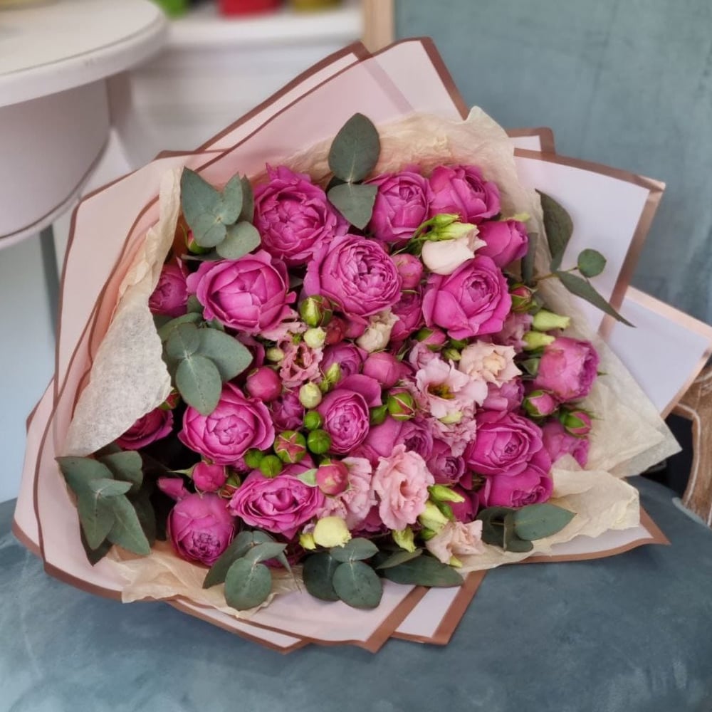 Нежные пионовидные розы с импортной эустомой в изящном оформлении