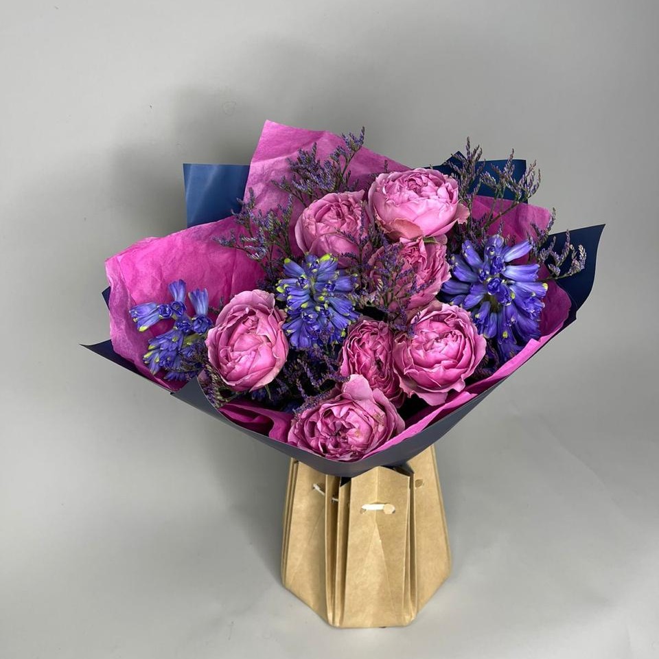 На первый взгляд этот букет может показаться обычным, но он обладает особым шармом и неповторимостью. Сочетание нежных роз мисти бабблс, игривого лимониума и ароматного гиацинта создает удивительную гармонию цветов и текстур. Букет упакован в прозрачную пленку, украшенную тишью и нежной лентой, что делает его идеальным подарком для любого случая. Этот букет будет радовать свежестью и красотой долгое время, становясь ярким украшением любого интерьера.