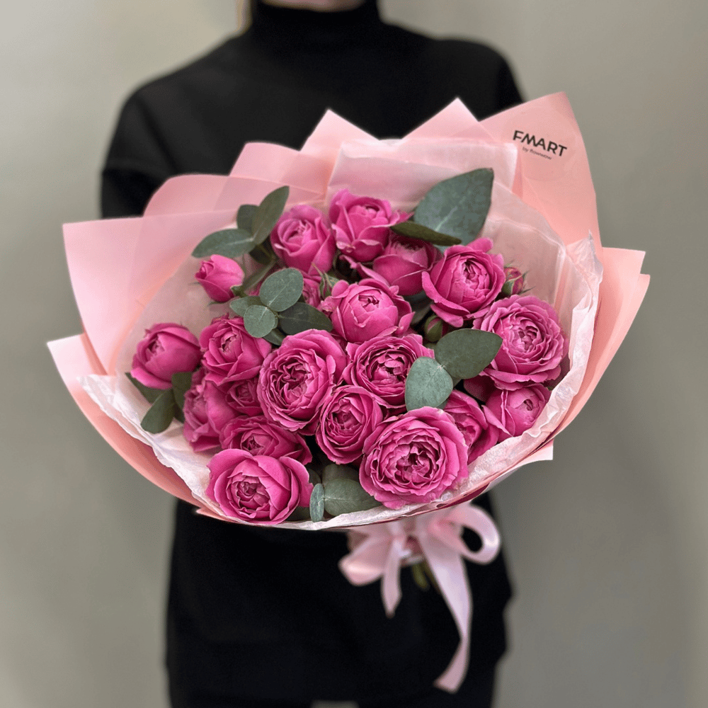 Моно букет Мистик - это утонченное сочетание изящной кустовой пионовидной розы Misty Bubbles и свежего зеленого эвкалипта. Этот букет излучает нежность и элегантность, благодаря своей изысканной ко...
