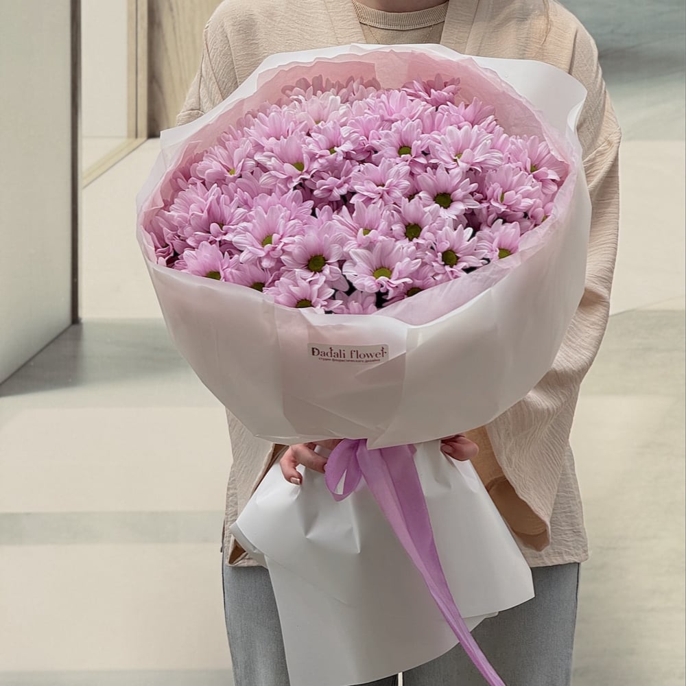 Букет из ромашковых розовых хризантем. Вы всегда можете купить такой букет с доставкой в нашем онлайн магазине цветов и подарков находящийся в г.Нальчике. Дарите настроение нами! Опытные флористы сформируют ваш букет из свежих цветов, и курьер в течении часа доставит Ваш букет по адресу лично в руки получателю, получив в ответ благодарную улыбку.