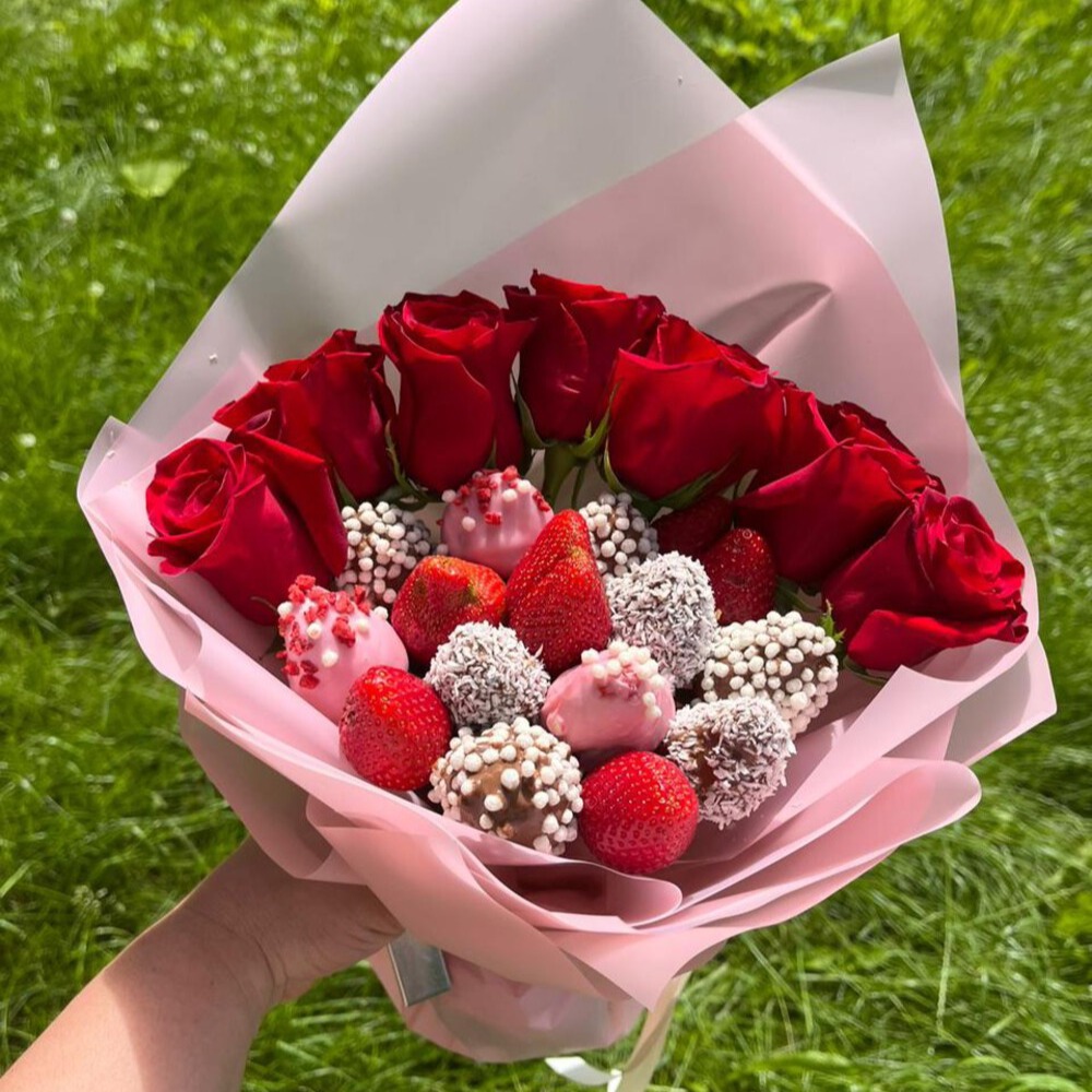 При изготовлении используется два вида наивкуснейшего белого,молочного,шоколада и топпингом из сублимированной малины, дутого риса,кокосовой стружки В букете используется 17-19 ягод клубники 7 шт красных роз Срок хранения 24 часа при температуре от +4 до +6 градусов.