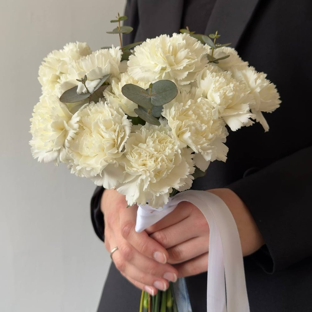 Этот букет невесты — воплощение нежности и элегантности. Основу композиции составляют белые диантусы, которые символизируют чистоту, искренность и утонченность. Их нежные лепестки создают ощущение легкости и романтики. Веточки эвкалипта добавляют букету свежести и природной гармонии, создавая приятный контраст с белыми цветами. Композиция оформлена в свободной форме, что подчеркивает её естественность и изысканность. Атласные ленты белого цвета завершают образ, добавляя букету торжественности и завершенности. Такой букет станет прекрасным акцентом в свадебном образе, подчеркивая нежность и утонченность невесты.