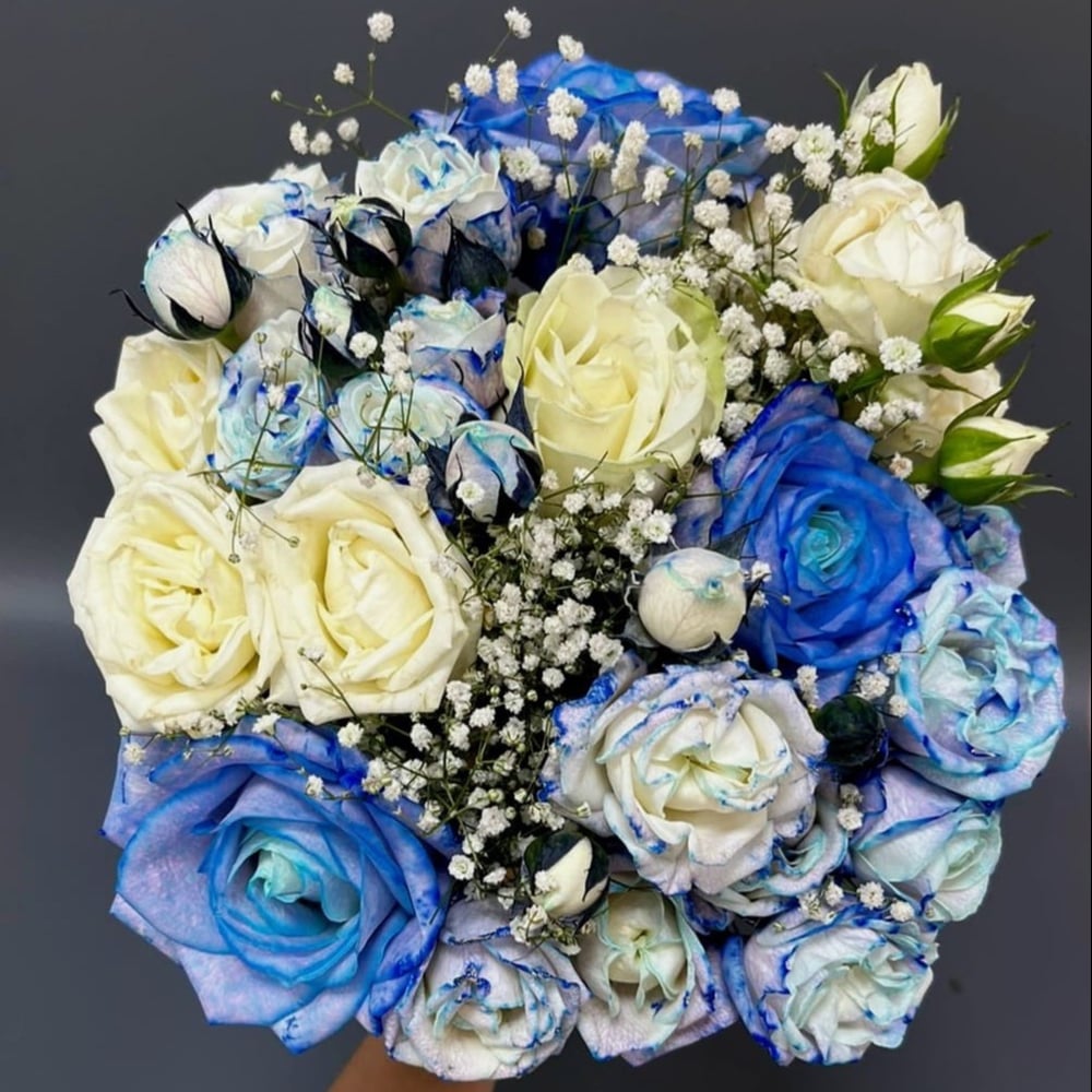 Классический букет невесты из роз разных сортов с веточкой гипсофилы в нестандартном цветовом решении.