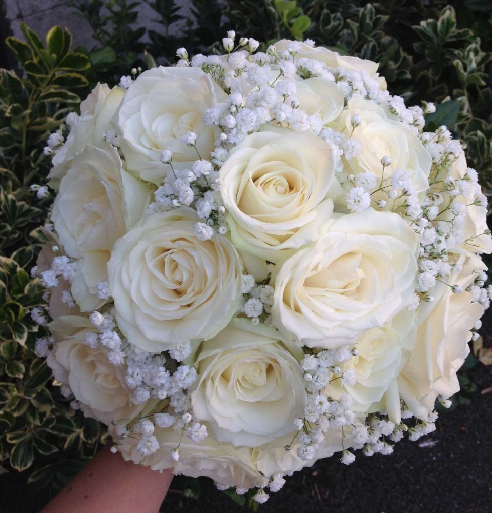 Букет невесты из роз и гипсофилы в форме шара станет отличным дополнением к свадебному платью с пушной юбкой, мини или брючному костюму.