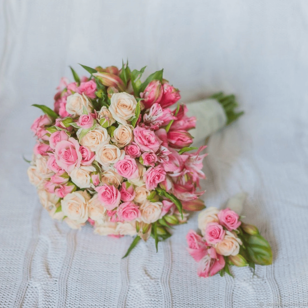 Свадебная пара из кустовых роз и альстромерий создают утонченную роскошную композицию для вашего торжества.