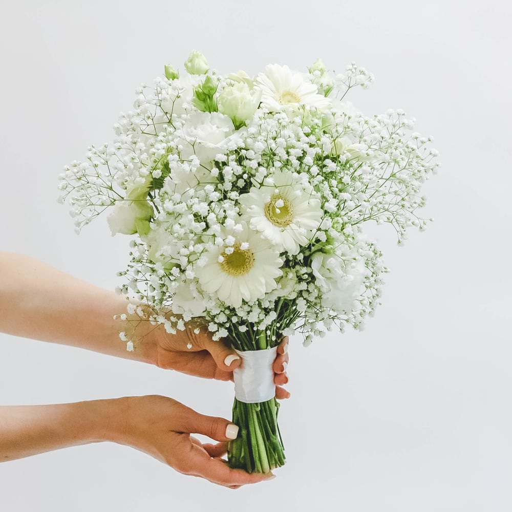 Лёгкий, утонченный, летний букет невесты из гербер и гипсофилы — один из трендов сезона. Особенно элегантно смотрится с лаконичным свадебным платьем.
