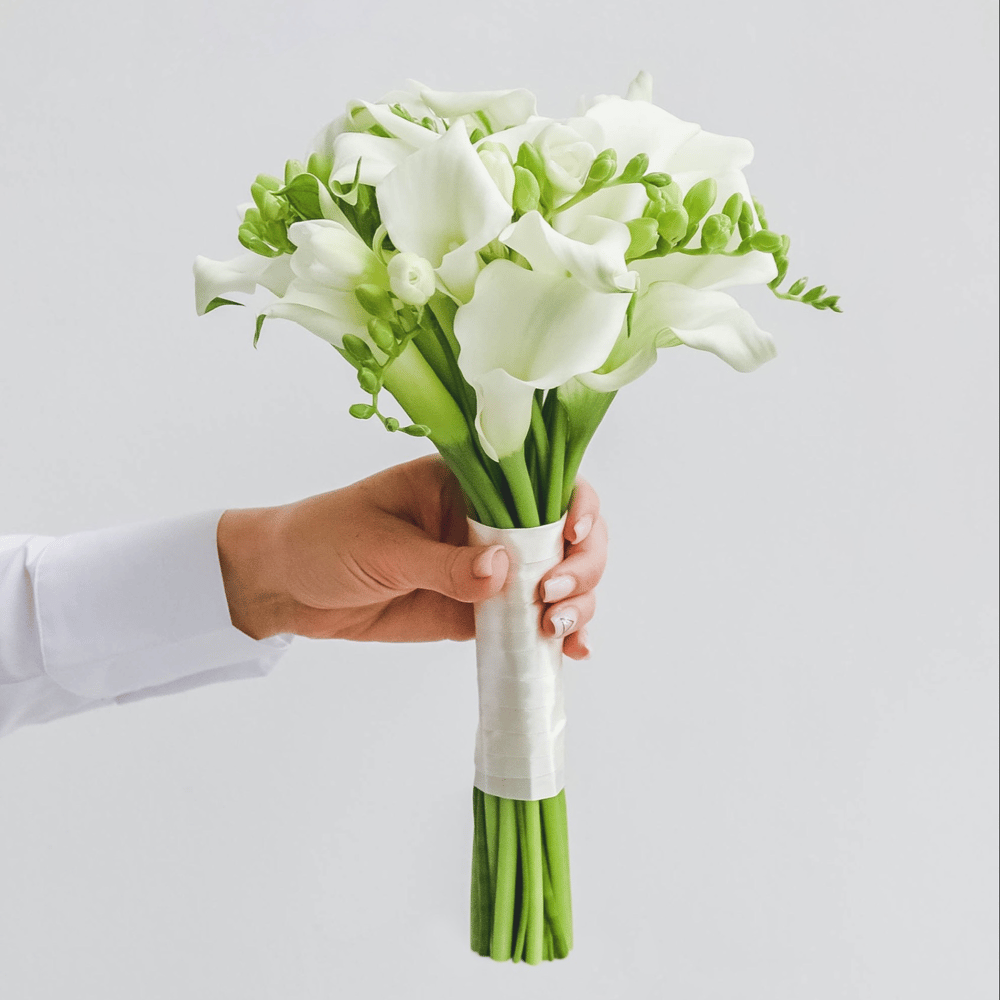 Каллы — невероятно стойкие цветы; они не боятся холода и могут долго обходится без воды. Возможно поэтому многие невесты предпочитают их в качестве свадебного букета. А еще элегантные каллы подчеркивают женственность и утончённость новобрачной. Фрезии символизируют молодость и доверие и являются символом серьёзных намерений и доверия к избраннице.