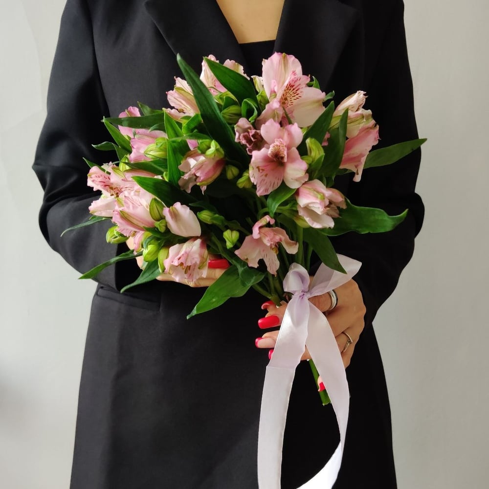 Этот элегантный букет невесты из альстромерий привлекает взгляд своей утонченной красотой и яркими оттенками. Лепестки альстромерий, украшенные характерными полосками, создают живую и динамичную композицию, наполняя ее атмосферой радости и легкости. Нежные цвета цветов гармонично сочетаются между собой, что делает букет очень стильным дополнением к свадебному образу. Особым акцентом является атласная лента, обвивающая стебли, которая придает букету изысканный вид и нежный блеск. Этот элемент добавляет нотку романтики и делает его идеальным аксессуаром для знатной невесты. Букет станет не только великолепным украшением, но и символом любви, счастья и нового начала, которые будут сопровождать в этот особенный день.