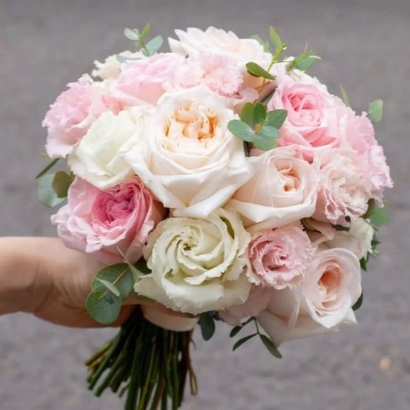 Букет невесты круглой формы из роз — элегантная классика. Композиция станет отличным дополнением к свадебному платью с пушной юбкой, а-силуэта, мини или брючному костюму.