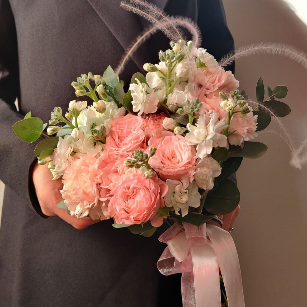 Этот букет невесты — воплощение нежности и утонченности. Основу композиции составляют кустовые пионовидные розы нежного розового оттенка, которые придают букету объем и изысканность. Их пышные бутоны создают романтичную атмосферу и подчеркивают женственность невесты. Маттиола добавляет букету легкости и воздушности благодаря своим тонким, изящным цветам. Светлые гвоздики создают контраст и делают композицию более выразительной. Веточки эвкалипта добавляют свежести и природной гармонии, создавая приятный фон для цветов. Букет оформлен в свободной форме, что подчеркивает его естественность и легкость. Атласная лента нежно-розового цвета завершает образ, добавляя букету элегантности. Такой букет станет прекрасным акцентом в свадебном образе, подчеркивая нежность и утонченность невесты.